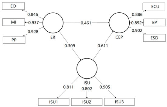 Subsequently, utilizing the scores obtained from the first-order constructs is the first stage to downgrade the corresponding higher-order constructs, followed by testing the structural equation modeling established in this study. The results show that the path coefficient of ER→CEP is 0.461, indicating a direct facilitating effect of environmental regulations on circular economy performance, and the path coefficient of ER→ISU→CEP is 0.189, indicating that the environmental regulation can indirectly promote the circular economy performance through the intermediary of industrial structure upgrading.