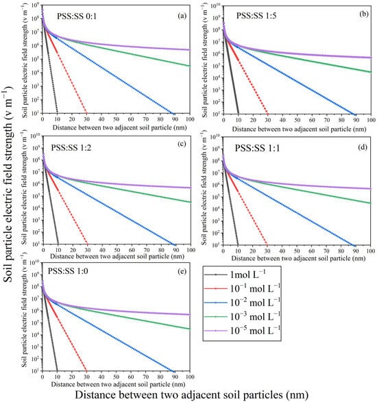 The electric field distribution curves around soil particles under different electrolyte concentrations can be further obtained based on the surface potential values and Equations (6)–(8). As shown in Figure 2, the electric field intensity decreased with the increase in the distance between particles. Similarly, the increase in electrolyte concentration also led to the reduction of the electric field intensity around soil particles, and the variation range of the surface electric field was sharply reduced. For example, the electric field action distance was only within 10 nm when the electrolyte concentration was 1 mol L−1; however, with the dilution of the electrolyte concentration to 10−5 mol L−1, the range of the electric field intensity increased rapidly, reaching more than 100 nm.