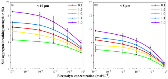 To investigate the effects of soil particle interaction forces on aggregate stability, the aggregate breaking strength of compound soils under different electrolyte concentrations is plotted in Figure 3. It can be seen that the aggregate breaking strength of compound soils followed the order of 1:0 > 1:1 > 0:1 > 1:5 > 1:2. It was observed that the breaking strength initially decreased followed by an increase in PSS under each electrolyte concentration. In other words, as the level of PSS amendment increased, the soil aggregate stability improved initially, reaching its highest point at the 1:2 ratio, before gradually weakening. The addition of Pisha sandstone improved the structural stability and erosion resistance of the compound soil. Additionally, we discovered that a low electrolyte concentration resulted in greater breaking strength. Under the condition of a high concentration (1 mol L−1) of electrolyte solution, almost no small particles were released or broken.