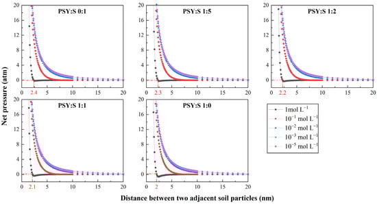 The net pressure between two adjacent particle surfaces is the sum of electrostatic repulsion, van der Waals attraction, and hydration repulsion, which was calculated according to Equations (9)–(12) (Figure 4). Generally speaking, Pisha sandstone is rich in montmorillonite and clay–silt particles; the addition of Pisha sandstone enhanced the van der Waals attraction force, reduced the net repulsive force between compound soil particles, and promoted the agglomeration of aeolian sandy soil. The overall trend of the net resultant force under different addition ratios of Pisha sandstone was 1:0 < 1:1 < 1:2 < 1:5 < 0:1. The negative value indicated that the compound soil particles were net attractive, which means that the addition of Pisha sandstone enhanced the agglomeration force and structural stability of compound soil particles. For example, when the concentration was 1 mol L−1, the distance of the sites corresponding to zero net pressure gradually decreased with the increase in the soft rock. At a high electrolyte concentration of 1 mol L−1, when the distance between adjacent soil particles of the compound soil was greater than 2.3 nm, except for the 0:1 treatment without the addition of PSS, the net pressure between soil particles under the other four compound soil treatments with the addition of PSS was negative, showing a net attraction. Recent studies have shown that when the distance between soil particles is less than 2 nm, the hydration repulsive force plays a leading role; meanwhile, the dry soil aggregates encounter water, the distance between particles extends to 1.5~2 nm by the hydration repulsion, and the soil aggregates expand only slightly [32]. When the distance between soil particles is greater than 2 nm, van der Waals attractive force and electrostatic repulsive force play a leading role, and the agglomeration or fragmentation of soil aggregates is affected by electrostatic repulsive force, van der Waals attractive force, and hydration repulsive force [32,33]. When two adjacent soil particles of compound soil were infinitely close together, at any electrolyte concentration, the net pressure of the five compound soils was always repulsive and could reach tens of thousands of atmospheres. For instance, at the ratio of 1:2 compound soil, the net repulsive pressure at the particle distance of 0.2 nm was about 10,700 atm at the electrolyte concentration of 1 mol L−1. In addition, when the electrolyte concentration was >10−2 mol L−1, the net pressure increased substantially with decreasing electrolyte concentration at the same distance. However, when the electrolyte concentration ≤ 10−2 mol L−1, the net pressure distribution curves almost overlapped. Here in, taking the compound soil with the ratio of 1:1 as an example (at a distance of 2 nm), when the electrolyte concentration decreased from 1 to 10−2 mol L−1, the increase in net pressure was 18.12 atm. However, when the concentration decreased from 10−2 to 10−5 mol L−1, the net repulsive pressure increase was only 0.42 atm. These findings showed that 10−2 mol L−1 was also the critical concentration affecting the net pressure of compound soil.