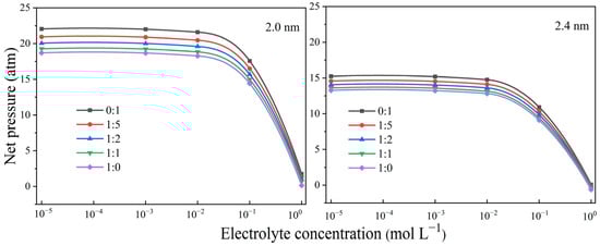 Net pressures at 2.0 nm and 2.4 nm distances between compound soil particles under different electrolyte concentrations and compound ratios.