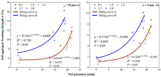 To further quantitatively analyze the combined effects of compound soil particle interaction forces and the compound ratio on aggregate stability, we established the relationship between the net pressure at a 2 nm soil particle distance and the aggregate breaking strength of the compound soils (Figure 6). The five compound soil samples with different volume ratios of Pisha sandstone and sandy soil (0:1, 1:5, 1:2, 1:1, and 1:0, v/v) were used to study the compound soil particle interaction forces and their effects on aggregate stability. Herein, the compound soils were classified into two categories based on the different Pisha sandstone mixed ratios (50% Pisha sandstone). There was a significant positive exponential relationship between the aggregate breaking strength and the soil net pressures. This indicates that the soil aggregate stability decreased exponentially with the increase in the net pressure of soil particles. Different proportions of compound soil cannot directly establish the relationship between the internal force and aggregate breaking strength. It is necessary to classify the groups of different compound proportions. When p < 0.05, the R2 values of fitting curve A and fitting curve B reached more than 0.7, which indicates that both force and particle composition had important effects on aggregate stability. For different compound soil samples, when the PSS content was below 50%, the stability of the aggregates was primarily influenced by SIFs between soil particles. Conversely, when the PSS content was 50% or higher, the stability of the aggregates was affected by both the fine particle content and soil interaction forces. The addition of different ratios of Pisha sandstone samples had different effects on the composition of the compound soil particles. Therefore, our results suggest that the aggregate stability of compound soils was not only affected by compound soil particle interaction forces but also by the granulometric composition and addition ratios of the Pisha sandstone samples.