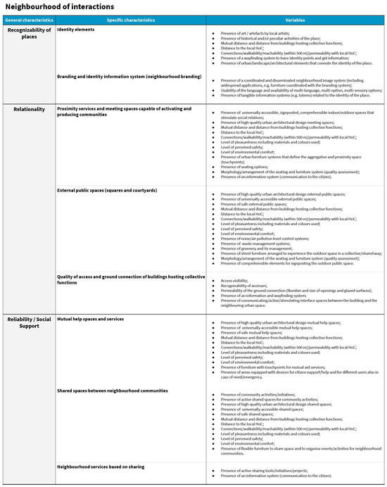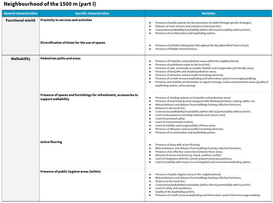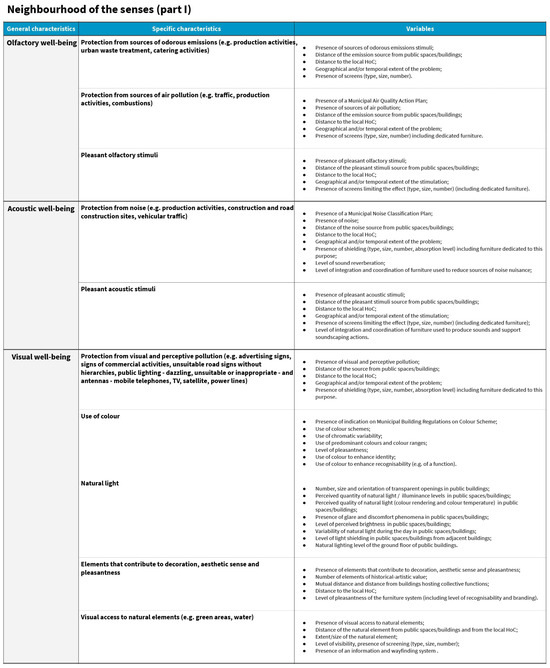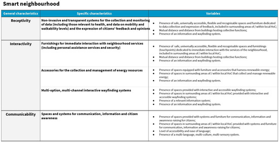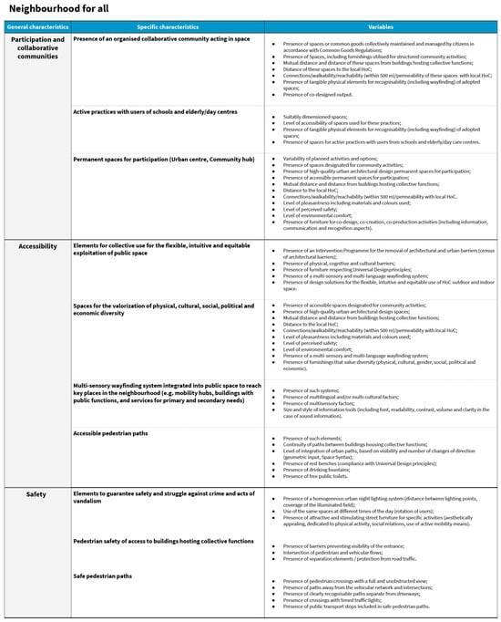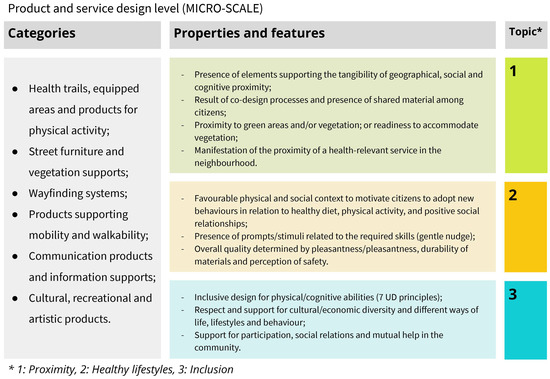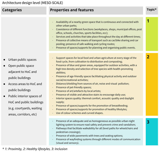 Applying a multilevel approach, researchers working at the regional and urban design level (macro-scale), architecture design level (meso-scale), and product and service design level (micro-scale) identified relevant categories for their respective design levels to address the creation of a healthy and inclusive built environment in Florence’s neighbourhoods. They assigned properties related to the three core topics under investigation to each category. The researchers extracted and summarised the properties and features from the data collection tables. Criteria for relevant categories identification and for properties selection from the data collection tables are related to the significance of impact of these items on the built environment design of urban public space and areas surrounding HoCs, according to HNH research project perspective. The criteria for identifying relevant categories and selecting properties from the data collection tables are based on the impact significance of these elements on the design of the urban built environment and areas surrounding HoCs in Florence neighbourhoods, as viewed from the perspective of the HNH research project.