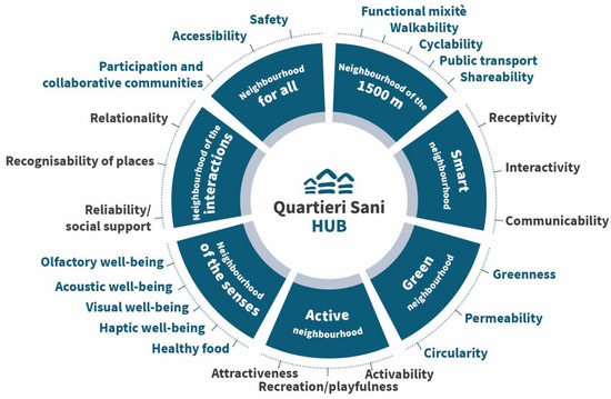 A compelling and relatively unexplored scenario within the Italian regulatory framework pertains to the neighbourhood scale. Adopting an “urban health advantage” viewpoint, which highlights the health-related advantages of city living, requires neighbourhoods to have a physical environment that is designed to be supportive of health and well-being [34]. To reach that goal, health should be considered a driver of built environment design, and people’s bio-psycho-social well-being [35,36] should be treated as a fundamental input to the design process, not just an expected result. This expands the notions of inclusion, accessibility, and usability by also promoting the adoption of healthy behaviours in neighbourhood contexts.