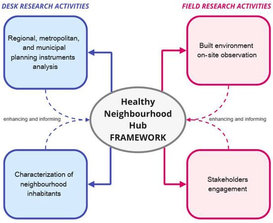 Based on these premises, the Healthy Neighbourhoods Hub (HNH) (Quartieri Sani HUB) research project [37,38,39] aims to establish a theoretical framework that can steer the development of healthy and inclusive neighbourhoods across various scales, including the regional and urban design level (macro-scale), architecture design level (meso-scale), and product and service design level (micro-scale). The research project brings together researchers from the Department of Architecture at the University of Florence, spanning four different disciplines: urban and landscape planning, architecture, and product design. The primary partners of the project, in addition to the University of Florence, are the Municipality of Florence, the Metropolitan City of Florence, the Local Health Authority (i.e., the Azienda USL Toscana Centro), the Florence Health Society (i.e., Società della Salute di Firenze), and an urban furniture manufacturing company (i.e., Metalco Group).