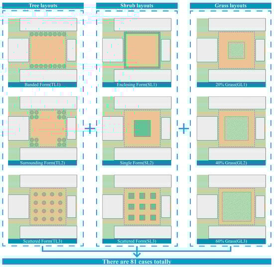 - Supported by statistical significance tests, the optimal plant layout configurations for courtyard spaces in hot and humid areas were identified as “scattered form (TL3)”, “single form (SL2)”, and “20% of lawn (GL1)”. Practical guidance was provided for improving the microclimatic conditions of courtyard spaces.