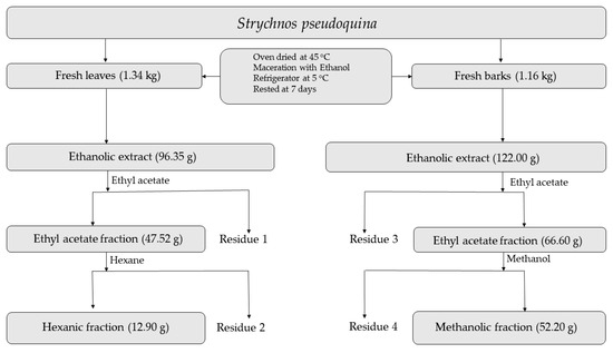 Fresh leaves and barks of S. pseudoquina were separately dried at room temperature and crushed in a knife mill. The product of this process was dipped in ethanol (96%) in an Erlenmeyer flask and left to rest for seven days. The material was then filtered through a separatory funnel using cotton; the solvent used was removed in a rotary evaporator, obtaining the final crude ethanolic extract (CEE). The CEE was used in a fractionation with the following solvents: ethyl acetate and hexane (for leaves) and ethyl acetate and methanol (for barks). The CEE was dissolved in the solvents for seven days and then vacuum-filtered with the incorporation of the adjuvant microcrystalline cellulose. The following leaf and bark extracts and fractions of these extracts were obtained at the end of this process, after removing the solvents in the rotary evaporator: crude bark extract; crude leaf extract; ethyl acetate fraction of bark extract; ethyl acetate fraction of leaf extract; methanol fraction of bark extract; and hexane fraction of leaf extract. Figure 1 shows the sequence of actions for obtaining the fractions of S. pseudoquina extracts used in the bioassays.
