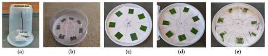 (a) Container with artificial diet used to rear neonatal larvae of Spodoptera frugiperda. (b–e) The sampling units used for the antixenosis test, with a chance to choose. Trays containing maize leaves treated with bark and leaf extracts of Strychnos pseudoquina. (c) Fourteen larvae of S. frugiperda (second instar) were released in the center of the tray. (d,e) Recordings at different times of where larvae were quantified on treated maize leaves.