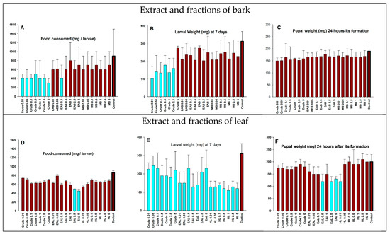 The larval weight of S. frugiperda seven days after ingestion of the crude leaf extract, as well as its fractions, at different concentrations, was significantly lower than that found for the control treatment (Figure 3E). Larval weight was significantly lower when the larvae ingested maize leaves treated with the crude bark extract compared to the other fractions of the bark extract and the control (Figure 3B). The ingestion of maize leaves treated with fractions of the bark extract at different concentrations did not cause a significant decrease in pupal weight (Figure 2C); the pupal weight of maize leaves treated with the ethyl acetate fraction (0.5%, 2.5%, and 5.0%) and the hexane fraction (0.01%) of the leaf extract was significantly lower compared to the other treatments and the control (Mann–Whitney test, at p < 0.05) (Figure 3F).