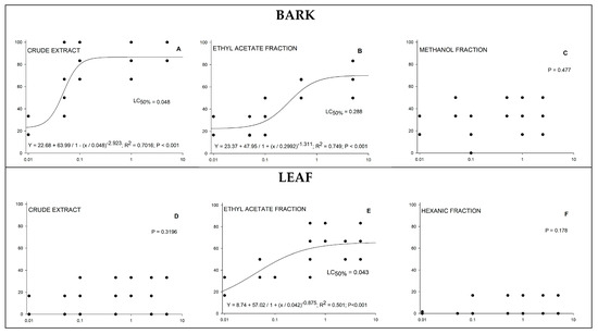 The larval mortality found for the crude leaf extract and its hexane fraction did not fit a logistic regression model (Figure 4D,F), confirming the low larvicidal effect of these fractions, as the lowest (0.01%) and highest (5%) concentrations resulted in larval mortalities similar to the control (Kruskal–Wallis test, at p < 0.05). The larval mortality found for the bark extract methanol fraction did not fit a logistic regression model (Figure 4C); however, even the lowest tested concentration differed significantly from the control treatment.