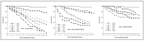 Ingestion of the ethyl acetate fraction of the bark extract by larvae at the highest concentration (5%) resulted in faster death than the crude bark extract and its methanol fraction, according to the Kaplan–Meier survival estimation (p < 0.001). Larval mortality of 50% occurred at seven days after application of the crude bark extract and at three days after application of the ethyl acetate fraction of the bark extract. The bark extract methanol fraction did not reach a larval mortality above 50% (Figure 5).