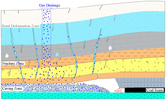 In recent decades, in order to maintain the sustainable development of the coal economy, the coal industry in China has shifted from traditional extensive exploiting to green and low-carbon development. With the increasing depth of coal mining, coal mines are facing more and more risks associated with disasters. Among them, preventing coal and gas outbursts and dynamic disasters is essential for ensuring sustainable and safe mining [1,2,3,4]. Deep high-gas coal reservoirs generally have the characteristics of high adsorption and low permeability. The coal mining activities disrupted the original state of the coal reservoir, thus damaging its integrity and further developing internal fractures. The gas primarily originates from the coal–rock bodies scattered at the bottom and the residual coal pillars on both sides of the abandoned mine voids [5,6,7]. The gas migration in the coal mining goaf is depicted in Figure 1; the gas exists in two states (free or adsorbed) within the fractured coal bodies. Under the effect of mining-induced pressure relief, the desorbed gas diffuses into microscopic pores and eventually gushes out from the fractured coal rock bodies through macroscopic cracks [8,9,10]. The pore–fracture structure within the coal rock bodies is a key indicator for evaluating reservoir information. The interconnected pore–fractures not only serve as the natural storage space for gas but also act as the main channels for fluid migration [11,12]. The characteristics of the pore–fracture spatial structure and its microscale seepage properties within the coal rock bodies are closely related to the extraction of gas. Therefore, to explore the evolution mechanism of coal and gas outbursts during coal mining, it is necessary to analyze the characteristics of the pore–fracture spatial structure and its microscale seepage properties in the fractured coal. The findings of this study will significantly contribute to enhancing coal mine safety production and promoting the sustainable development of the coal industry.