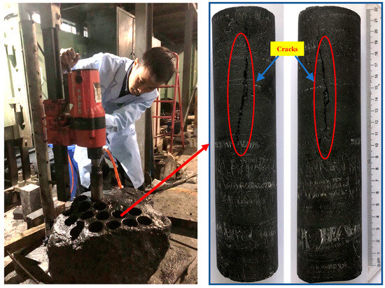 The large-sized coal blocks from the mining goaf were transported to the laboratory for processing. It is worth mentioning that the specimens utilized in the test were obtained from the 8119 working face and of No. 3–5 Coal seam in Tashan Coal Mine in Datong City, Shanxi Province, which belongs to the carboniferous coal seam. Due to their substantial size, nearly half a cubic meter in volume, these blocks were secured onto the base platform of a drilling rig. A water drill was employed to core these blocks, maintaining a steady drilling speed to minimize damage to the specimens. The process was illustrated in Figure 2. During the process of drilling and coring a large coal block, a specimen containing natural cracks was accidentally discovered. It can be observed that the two ends of the specimen are complete, and there is a natural macrocrack in the middle. The diameter of the specimen is 50 mm, and the length is approximately 200 mm. The cracks are distributed in a curved shape along the specimen length, with a maximum length and width of 105 mm and 0.5 mm, respectively. Notably, obtaining such a specimen with a natural fracture is exceedingly valuable. Such a specimen is a rare find compared to the millimeter-sized specimens commonly produced in laboratories; this specimen is significantly larger and contains a natural macroscopic fracture that is distinctly different from the fractures in damaged specimens and artificially pre-made fractures. It can more accurately reflect the reservoir information of the fractured coal body in the mined-out area.
