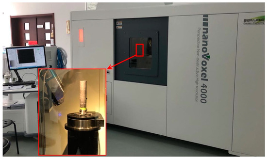 To reflect the spatial structure characteristics of pores and fissures inside the aforementioned natural fissure coal body, X-ray computed tomography (CT) was utilized to conduct the test. The equipment is illustrated in Figure 3. The high-penetration CT system equipment is the NanoVoxel-4000 switch reflection type of Sanying Precision Company (Tianjin, China), which is equipped with a 190 kV voltage and 140 uA current microfocus ray source, a working turret, and a flat-panel detector; has both high resolution and high penetration capability; and can ensure penetration of large-size samples. Meanwhile, high precision is ensured. The exposure time is 0.6 s, and the number of acquisition frames is 5400. The spiral scanning mode is utilized to quickly scan the specimen. The number of turns is 5, and the pitch is 106. The number of scanned cross-sectional images is 4226, and the number of longitudinal images is 4226. The number of cross-sectional images is 1764, and the spatial voxel is 29.15 um. After the scanning is completed, the 8-bit data volume is imported into the three-dimensional visualization software Avizo 9.1 to construct a three-dimensional digital core.