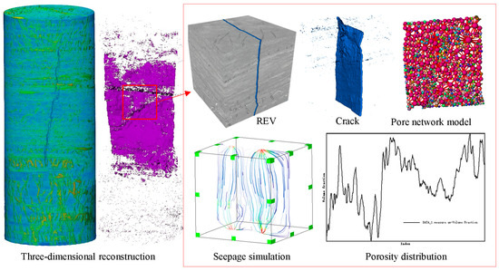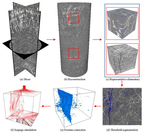 The reconstruction processes of the naturally fractured coal samples are depicted in Figure 4. To more effectively illustrate the characteristics of pores and fissures within the natural fissure coal body, a three-dimensional reconstruction of the scanned two-dimensional image is required, which primarily involves several steps [30,31,32,33]. Initially, the two-dimensional slice image undergoes preprocessing, filtering, and noise reduction to eliminate any artifacts or noise induced by scanning equipment or human errors, which enhances the clarity of the structure in the image while preserving its integrity. Subsequently, the two-dimensional slice data are imported into the three-dimensional visualization software, Avizo. Based on the distinct gray values exhibited by different substances, appropriate threshold intervals are set to extract components such as pores, cracks, and various mineral matrices, which enables the separate presentation of connected pores and isolated cavities, and the calculation of the radius, surface area, pore throat, and coordination number of each hole in the model for quantitative analysis. However, due to the limited memory space of laptop computers, there can be issues with insufficient memory when analyzing and calculating the entire specimen. Therefore, the representative elementary volume (REV) is chosen to accurately represent the material properties for further analysis of the pores–cracks characteristics. The seepage module is subsequently employed to simulate the pressure applied to the upper and lower parts, respectively. The seepage path is visualized through streamline distribution, and the distribution of permeability, flow velocity, and pressure can be simultaneously displayed.