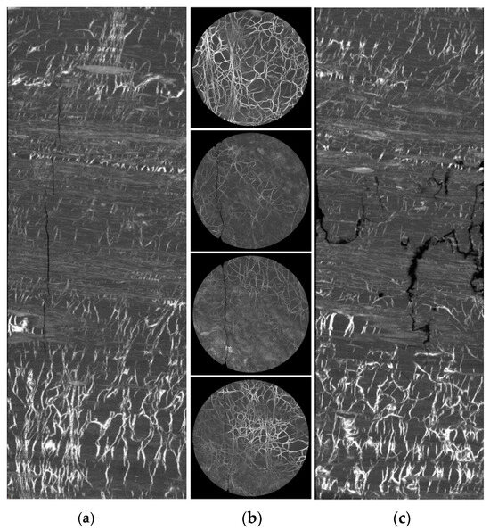 Based on the aforementioned operation process, we delve into the distribution of the pore–fissure structure in coal samples, utilizing the two-dimensional slice diagrams that we have acquired. It is crucial to highlight that this study chose a handful of representative CT slices from a series of natural fissure coal sample CT slices for further analysis. As illustrated in Figure 5, we present the slice diagrams of fractured coal samples. Upon examination, the surface of the original sample is speckled with black and white spots, which is indicative of various minerals. The predominant shades of gray and black represent the natural carbon element. Concurrently, a minor presence of white spots signifies a small quantity of clay minerals, and the intersecting white lines observed are kerogen. In addition, it can also be observed that there is an apparent macrocrack inside the sample, which is distributed at the left edge. From the image, it is apparent that the internal structure of the cracked coal sample is relatively dense and that this internal structure is modified as the number of layers changes; moreover, the morphological characteristics of the cracks will also change accordingly. Combining the longitudinal slices in the XZ direction and YZ direction below, it can be observed that the height of the sample is 150 mm, and the upper and lower ends of the sample are relatively complete without apparent macro cracks. The cracks are mainly distributed in the middle layer of the sample and at the upper end. The change from top to bottom is also a gradual process. The cracks are mainly distributed on the left side of the specimen. From top to bottom, the openings of the original cracks at both ends are smaller. From top to bottom, the process is from small to large and then to small. Cracks initiate and gradually expand along the weaker areas of the specimen edge.