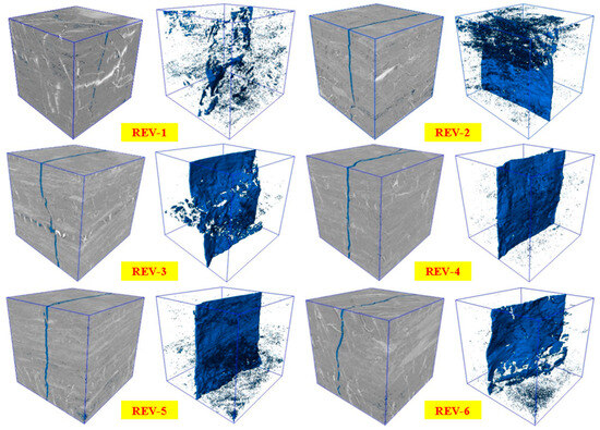 By comparing the distribution pattern of pore cracks in each unit body, it can be observed that macroscopic cracks and pore cracks coexist in the unit body, and pore crack structures of different sizes and shapes are formed in the interior of the fractured coal body. The REV-1 unit body exhibits inconspicuous penetrating cracks; the distribution of pore cracks in the piece is the least; the macroscopic cracks are apparently different from other units; and their connectivity and width are apparently smaller than other units. Moreover, there are some sporadic isolated pores randomly distributed around the distribution in the unit, and their number and volume are less; REV-2 bottom macroscopic cracks are developing, and there are some sporadic distributed pores at the top; and the crack opening gradually increases from the top to the bottom. REV-3 and REV-4 units are more similar: they are all penetrated by a macroscopic longitudinal crack, which presents a near-vertical shape with a certain width. A large number of pores are distributed around the macrocracks, and some pores are connected to the cracks. The REV-5 and REV-6-unit bodies are more similar; in addition to the existence of a longitudinal crack in the middle, the unit body is filled with pores of different sizes, and the difference with the other specimens is that the pore–crack structure in the cell body significantly increased. Generally, the large number of pore clusters provides a satisfactory storage space for the gas in the coal reservoir. It can also be observed that there is an apparent through-fracture surface in the longitudinal direction in each model, which provides a favorable channel for the diffusion and seepage of gas in the coal for the transportation of fluids in the fractured coal reservoir.