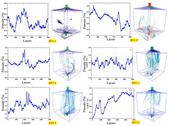 It can be observed that the porosity in each unit body fluctuates up and down along the layers, and the regularity of each curve is not apparent. The amplitude of fluctuations is related to the distribution of pores and cracks. The density of isolated pores and changes in the opening of penetrating cracks can affect it. However, in general, their porosity gradually increases with the increase in height, and the maximum porosity that appears at the minimum porosity size is 2.3% in REV-5 and 0.0004% in REV-6, which is consistent with the aforementioned distribution characteristics of pores and cracks presented. The distribution of these porosities is related to the migration of fluid.