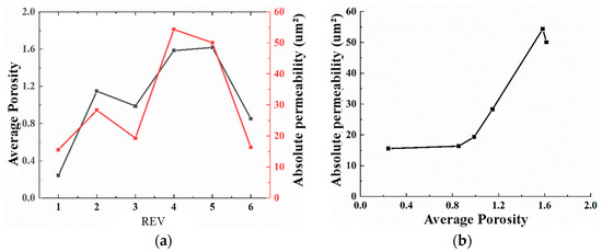 The average porosity and absolute permeability change curve. (a) porosity and permeability (b) absolute permeability with porosity.