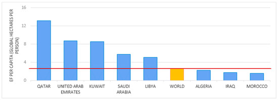 The previous discussion suggests there is an ongoing debate regarding the environmental repercussions of natural resources, with no definitive conclusions reached. This study investigates the impacts of natural resources on environmental degradation, as measured by the ecological footprint (EFP), in Middle East and North African (MENA) countries. By doing so, the study contributes to the current literature in different ways. First, despite the increasing number of studies on the subject, little is known about the environmental implications of natural resources in MENA countries. The selection of MENA countries is based on a number of considerations. On the one hand, MENA countries are well-endowed in natural resources, including oil and gas. According to ref. [7], the MENA region accounts for about 58% of global oil reserves and 43% of global natural gas reserves. In addition, statistics from ref. [8] suggest that, in 2021, total natural resource rents represented 61% of the gross domestic product (GDP) in Libya, 43.4% in Iraq, 27.2% in Qatar, and 25.5% in Saudi Arabia. This situation made the MENA region a significant global player in the provision of natural resources, which has the potential to impact international economic prosperity [9]. However, MENA resource-abundant countries have become increasingly reliant on natural resources and sensitive to global energy price fluctuations. Indeed, natural resources are extremely important in most MENA resource-rich countries, as their economies rely heavily on natural resource revenues. On the other hand, the MENA region is among the most polluted regions worldwide and is highly impacted by climate change [10]. Ref. [11] stated that several cities in the MENA region exhibit very high levels of air pollution, placing them among the most polluted worldwide. At the same time, MENA countries have higher rates of marine plastic pollution per capita. Considering simultaneously the natural resource abundance in MENA countries and the deterioration of ecological indicators, it is interesting to examine empirically whether natural resource exploitation has contributed to the current environmental degradation. Figure 1 depicts the EFP per capita in selected resource-abundant MENA countries and the world. As shown, the EFP in most MENA countries is higher than the world average (2.58 gha per person). Specifically, Qatar and the United Arab Emirates exhibited the highest EFP in 2022, with 13.13 and 8.71 gha per person, respectively.