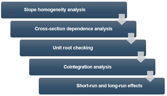 The empirical study consists of many steps. First, a preliminary analysis is conducted to assess the existence of slope homogeneity (SH) and cross-section dependence (CSD) between countries. Second, we test the stationarity based on the cross-sectionally augmented IPS (CIPS) unit root test. The use of the CIPS panel unit root tests is mandatory in the presence of CSD. Then, we check on long-run relationships between the different variables using the demeaned Pedroni cointegration tests proposed by ref. [46,47] and the ECM-based panel cointegration test developed by ref. [48]. Finally, we employ three distinct methodologies to estimate the short-run and long-term impacts of resource rents on EFP: dynamic fixed effects (DFE), pooled mean group (PMG), and mean group (MG) estimators. The Hausman test is employed to identify the appropriate technique. Figure 2 summarizes the flowchart of the empirical investigation.