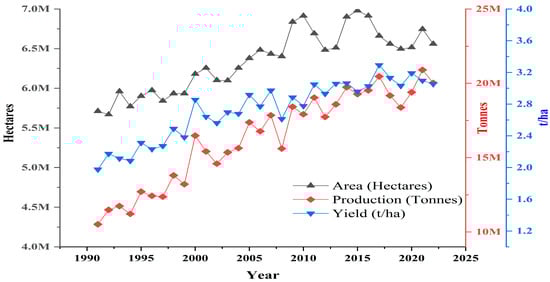 Area, production, and yield of wheat (t/ha) in Punjab Province (1991–2022). Source: Crop Reporting Service, Punjab, Pakistan [35].