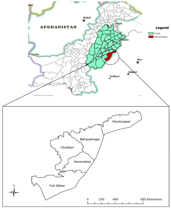 As shown in the Figure 2, the Bahawalnagar district is located in southern Punjab but is classified inside the cotton–wheat zone based on its agroclimatic conditions. Bahawalnagar is situated between latitudes 20°51′ and 30°22′ N and longitudes 72°17′ to 73°58′ E. Bahawalnagar district ranks first among the 36 districts of Punjab in terms of its contribution to the total acreage of agricultural land cultivated with wheat and its share in total wheat output in Punjab. Bahawalnagar district’s land cover is classified into various categories, with irrigated crops comprising the most significant area (66%). According to the Punjab Forest Department [38], Bahawalnagar has 971,209.4 acres of agricultural land. Most of the agricultural land in Bahawalnagar has been allocated to the cultivation of wheat and cotton. The district of Bahawalnagar has a mostly dry and hot temperature during the summer.