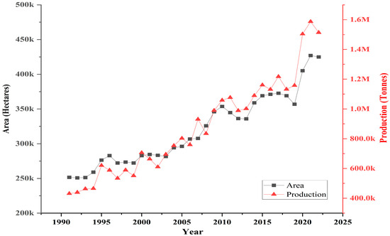 Area and production of wheat in Bahawalnagar (1991–2022). Source: Crop Reporting Service, Punjab, Pakistan [35].