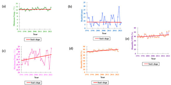 Sen’s slope values provide useful insights into the direction and magnitude of trends in climatic parameters, allowing us to understand long-term patterns and changes in environmental conditions. Sen’s slope, derived from the MK test, provides a measure of the magnitude of the trend observed in the respective climatic parameters over the given time period (Figure 4). In this context, a negative Sen’s slope value, such as for annual rainfall (−0.008), suggests a slight downward trend, although not statistically significant, indicating a minor decrease in rainfall over time. Conversely, positive Sen’s slope values, like those for maximum temperature (0.037), minimum temperature (0.007), humidity at 8 AM (0.275), and humidity at 5 PM (0.167), indicate increasing trends. These positive slopes indicate a gradual rise in temperature and humidity levels, with higher values indicating steeper upward trends (Figure 4).