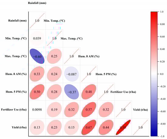 Correlation matrix presenting the relationship between different variables; each cell shows the Pearson correlation coefficient between variables, 1 indicating a stronger positive correlation, and −1 indicating a stronger negative correlation. The color intensity and the size of the ellipse in each cell indicate the strength of the correlation, with red representing positive and blue denoting negative correlations. Source: authors’ own attribution based on data from the Metrological Department and Agriculture Department.