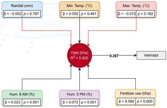 The model parameters provide insights into the relationship between wheat yield and the various climatic factors considered (Figure 6). In our findings, the intercept value (0.267) represents the expected wheat yield when all predictor variables are equal to zero. The high intercept value can be attributed to factors such as residual soil fertility or irrigation, which contribute to a baseline yield even in the absence of the measured variables. The coefficients for humidity at 8 AM and 5 PM are 0.023 (0.001) and 0.007 (0.001), respectively. These positive coefficients suggest that for every unit increase in humidity at 8 AM and 5 PM, the wheat yield is expected to increase by 0.023 and 0.007 tons per hectare, respectively, holding other variables constant. Studies have shown that adequate soil moisture, which can be affected by the level of humidity in the atmosphere, is essential for optimal wheat growth and yield. Bramley et al. [45] emphasize the significance of soil moisture, influenced by climatic factors such as humidity, as the main factor affecting the potential crop production in wheat and barley fields. The coefficient for rainfall is −0.002 (p = 0.767) which indicates that for every unit increase in rainfall, the wheat yield is expected to decline by 0.002 t/ha, holding other variables constant. However, the correlation was non-significant. Hochman et al. [46] found that the wheat yield potential in southern Australia has dropped because of decreased rainfall. On the other hand, increased precipitation at the post-anthesis stage increases the risk of disease and insect attacks in wheat crop [47]. Increased rainfall leads to waterlogging, which delays harvesting and results in seed sprouting in the field [48]. The coefficient (0.050, p = 0.461) of minimum temperature shows a non-significant positive relation with wheat yield. Previous research indicates that an increase in temperature decreases the photosynthetic process in wheat plants and accelerates leaf senescence [49]. It alters the water dynamics in wheat, leading to a decrease in water-use efficiency in wheat crops [50]. The coefficient for fertilizer use (t/ha) is 9.589, indicating a strong positive association with wheat yield (p-value < 0.0001), highlighting the importance of fertilizer application in enhancing crop productivity. A meta-analysis [33] conducted on the effect of chemical nitrogen fertilizer application on wheat output in Africa and China revealed that the appropriate use of nitrogen fertilizer leads to a substantial improvement in wheat production. This effect is particularly important for food security, as it allows for more production on the same amount of land.