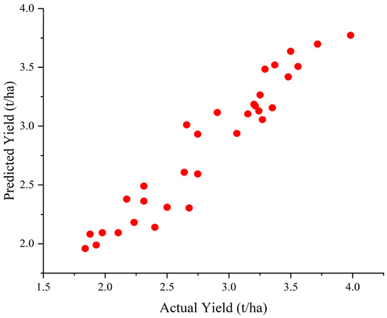 The regression analysis for the variable “Yield” indicates that the model has an excellent goodness of fit (Table 4). With 32 observations and 25 degrees of freedom, the model explains approximately 92% of the variance in the yield data, as indicated by the R2 value. The adjusted R2 of 0.901 indicates that over 90.1% of the variance in yield is explained by the independent variables, taking into account the number of predictors in the model. The mean squared error (MSE) is 0.035, and the root mean squared error (RMSE) is 0.187, indicating the average deviation of the observed values from the predicted values by the model. The ANOVA indicates that the regression model is statistically significant (F = 48.242, p < 0.001), indicating that at least one independent variable strongly predicts wheat yield (Table 4).