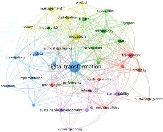 The keyword co-occurrence network analysis delves into the interrelationships between critical terms relevant to sustainable digital transformation (SDT) initiatives within small- and medium-sized enterprises (SMEs). In particular, “digital transformation” appears as the central theme, with a significant incidence of 39 and a solid link strength of 123, which shows that the literature review was correct and consistent with the research topic. Moreover, this result highlights the overall focus on leveraging digital technologies to achieve transformative change in SME contexts. Additionally, “innovation” stands out with 13 occurrences and a tie strength of 71, underscoring the emphasis on fostering innovative approaches within SDT frameworks. Furthermore, the presence of terms such as “big data”, “technology”, and “sustainability” with notable occurrences and strong links suggests the multifaceted nature that needs to be considered in the design of the SDT framework, encompassing the aspects of data-driven decision-making, technological advancements, and sustainability principles. This analytical approach provides deeper insights into the interrelation of critical concepts that shape and support the creation of the SDT framework for SMEs.