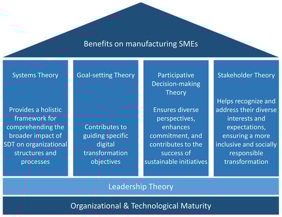 Systems theory is a critical pillar in SDT, offering profound insights into the interplay between digitalization and sustainability within organizations. At its core, systems theory views organizations as complex systems with interconnected components, emphasizing the significance of understanding their holistic functioning [74]. Consequently, systems theory proves invaluable in the SDT process, where the convergence of the digital and sustainable dimensions necessitates a comprehensive perspective. This approach encourages organizations to move beyond isolated initiatives and perceive the entirety of their operations as an interconnected system [75]. It underscores the idea that changes in one part of the organization have cascading effects on the entire system, emphasizing the need for a synchronized and integrated approach to SDT.