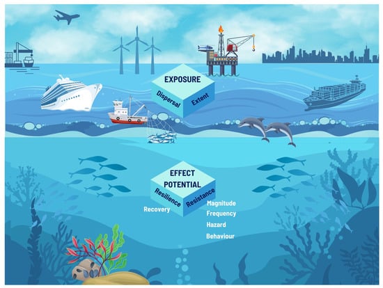 The IR is evaluated through the assessment of scores assigned to seven criteria. These criteria include (1) the spatial (extent), (2) dispersal, and (3) temporal (frequency) overlap between a pressure generated by a particular sector of human activities and ecological characteristic, collectively characterizing the exposure of the ecological component to a sector–pressure combination in terms of their spatiotemporal concurrence; (4) hazard; (5) magnitude; (6) behavior; and (7) the resilience of the ecological characteristic (recovery time in years) [33,34,36,37,38,47] (Figure 2, Table S2).