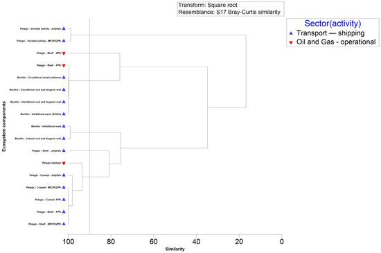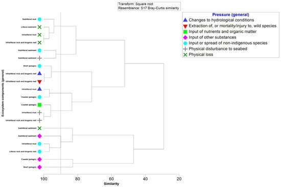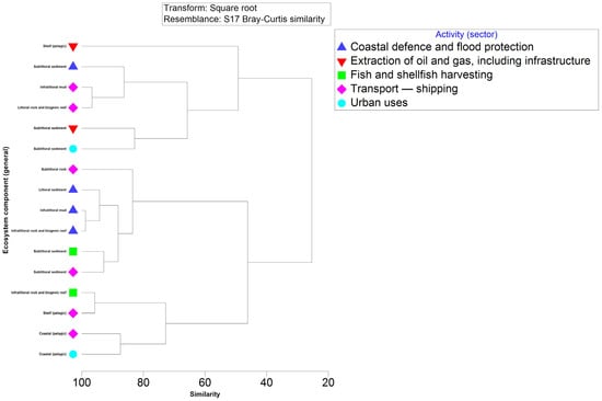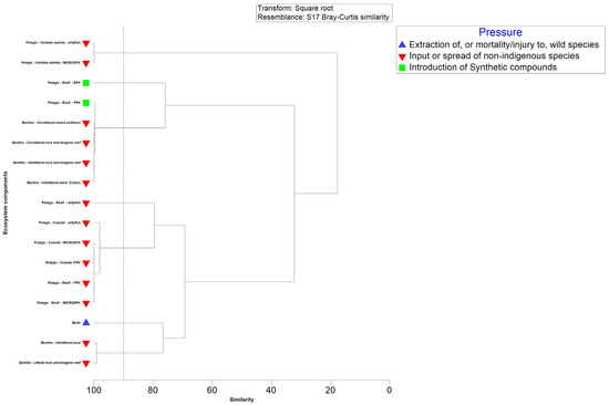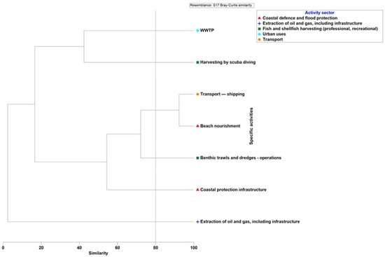 Organizing the ecosystem components based on activities, clusters of 100% similarity of IR for the pelagic habitat, attributed to shipping activities and wastewater treatment plants (WWTPs), were observed based on the introduction of nutrients and organic matter pressure (Figure 9). Similarly, the benthic component formed high-similarity clusters due to shipping, beach nourishment, and WWTPs. Beach nourishment directly and indirectly suppresses benthic macrophytes by depositing substantial amounts of silty mud. Fish and shellfish harvesting pose a threat to the marine ecosystem, and dredging operations and certain fishing practices not only damage bottom landscapes and biocenoses but also exert a significant impact on the overall ecosystem. Notably, WWTPs impact macroalgae and seagrass, with these components also affected by beach nourishment. Shipping activities pose a threat to the benthic community, particularly in the circalittoral and infralittoral zones (clusters of 100% similarity of IR) (Figure 9).