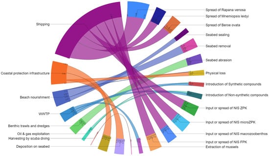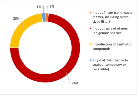 The pressures were represented by input of non-indigenous species, physical loss, and physical disturbance of the seabed (Figure 5), because of the main identified activities. The main pressure (introduction of non-indigenous species) was detected in 21 out of 45 instances, followed by physical loss occurring 7 times, and the input of other substances was noted 6 times.