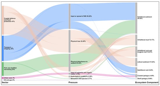 Our study revealed that activities such as shipping, followed by coastal defense and flood protection, exert the highest impact on ecosystem components (Figure 3). Among the 45 linkages from 5 sectors, coastal defense and flood protection were observed in 11 instances, while shipping was identified in 28 instances.