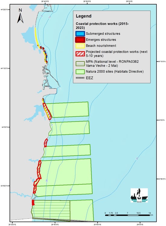 Our study revealed that, due to the significant beach nourishment efforts across the central and southern sections of the Romanian coast, coastal defense causes temporary or reversible disturbances to infralittoral rock and biogenic reefs through physical disturbance to the seabed and leads to physical loss by inducing permanent changes in seabed substrate or morphology. Human intervention, including the construction of coastal protection structures, ports, and leisure infrastructure, significantly affects coastal areas both directly, by altering shore morphology, and indirectly, by modifying the natural hydrological regime. The shoreline responds dynamically, continuously adjusting to the characteristics and influences of both natural and human-induced factors [99,100]. The presence of alongshore protecting structures impacts the coast, resulting in a significant loss or elimination of natural habitats [101]. The transformation of habitats due to coastal development can influence biodiversity, distribution patterns, trophic interactions, community compositions, and the quality of nursery habitats within the estuarine ecosystem [101]. Beach nourishment was carried out in the area between Constanta and Mamaia, as well as in the touristic resort Eforie North, on five beach sectors (Figure 14). The cumulative length is about 7.3 km, and the area of the five beach sectors has been increased by 60.66 ha. On 12 October 2020, the National Administration “Romanian Waters” announced in a press release that works have started for the second phase of the project, as well as for the first stage of beach nourishment in Navodari and Mamaia, and stated that following these works, the width of the beaches would increase to 100 m. In the absence of official explanations, it is difficult to understand the reason why the width of the extended beaches ultimately exceeded 200–250 m, even 300 m, in some places [56].