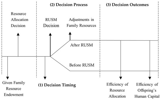 Family strategy focuses on the timing, process, and outcomes of decisions made by families and their members. The goal of these strategies is to consolidate or improve the economic status of the family and its descendants, involving the generation and distribution of resources [32]. Rural families, possessing limited resources, must strategically allocate these resources to maximize their value and economic returns to accumulate within the family. Concurrently, rural families must consider how to distribute these resources across generations to invest in their children’s human capital, thereby creating new familial human capital. In this context, education plays a critical role, as it is crucial to enhancing the human capital of the next generation [33]. Therefore, under the strategic goal of “maximizing comprehensive utility centered on education”, China’s rural households implement decision-making pathways for RUSM (Figure 2). (1) Decision timing: The critical decision-making time for RUSM coincides with the generation of offspring. Before the birth of children, the strategic goal of rural households is to maximize the family’s income within the constraints of the family’s resources and to make decisions on resource allocation accordingly. After the birth of children, the focus shifts to maximizing current consumption and the human capital of the offspring within the constraints of the family’s income. (2) Decision process: Upon the birth of children, rural families face educational decisions (e.g., decisions about RUSM). Such mobility disrupts the equilibrium of resource allocation within rural households, leading to dynamic post-mobility adjustments in the family’s resources. (3) Decision outcomes: Differentiated decisions on RUSM and resource allocation adjustments among various rural households lead to divergences in the efficiency of resource allocation. Consequently, RUSM significantly impacts the resource allocation efficiency of China’s rural households.