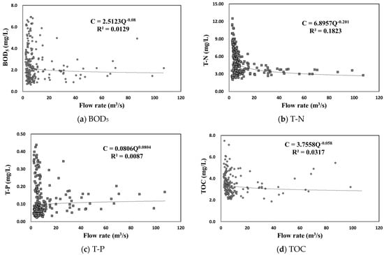 Park (2007) applied the watershed slope and flow rate per unit area of the watershed, but the parameter calculation was too complicated [12]. Lee (2002) considered the ratio of daily runoff to the annual average runoff, but there were limitations in applying it to unmeasured watersheds [31]. Ha et al. (1998) applied the distance ratio reduction factor to the emission load [32]. Eom (2004) applied area ratio discharge and shape coefficient, but there were limitations in predicting changes according to discharge type (point/non-point) [33]. Despite several studies being conducted to improve it, interpreting the changes in the water quality as a function of the flow rate remains difficult (Figure 2).