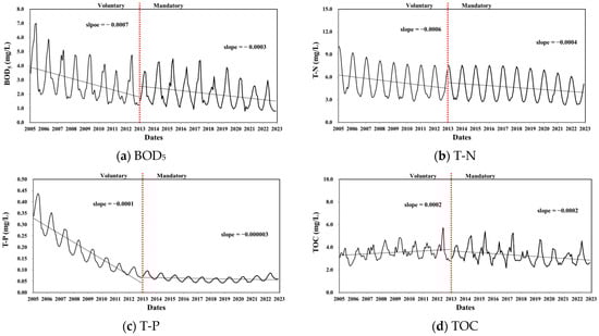 The TMDL was voluntarily implemented before 2013 and became mandatory from 2013 onwards. The concentration changes (slopes) of target substances, such as biochemical oxygen demand (BOD5) and T-P, showed negative slopes, indicating improved water quality. The larger slope during the voluntary phase compared with that during the mandatory phase can be attributed to the expansion of the environmental infrastructure, which was facilitated by prioritized financial support. Notably, the T-P concentration drastically improved, likely owing to the execution of reduction plans (advanced treatment) under the TMDL. This supports the results of previous studies that showed the expansion of STPs in the watershed following implementation of the TMDL: the construction of public STPs and the installation of T-P treatment facilities have strengthened discharge water quality standards [20].