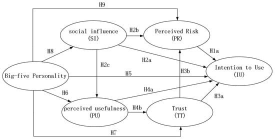 The model consists of six main components: perceived risk, social influence, trust, perceived usefulness, five personalities, and intention to use. Based on the research background and research model, combined with the related literature, this study proposed some hypotheses and verified them. This section describes the rationale for all the variables in this model and presents the hypotheses.