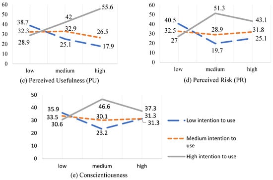 In addition, personality can also be used to predict the intention to use autonomous vehicles. A study by Neil et al. [] found that people with higher levels of conscientiousness were less eager to adopt autonomous vehicles, but that conscientiousness moderated the relationship between subjective norms and the intention to use the technology, and that neuroticism was negatively correlated with the perceived usefulness of the new technology. Based on the definition of the Big Five personality traits and the findings of related research, the following hypotheses are proposed in this study: