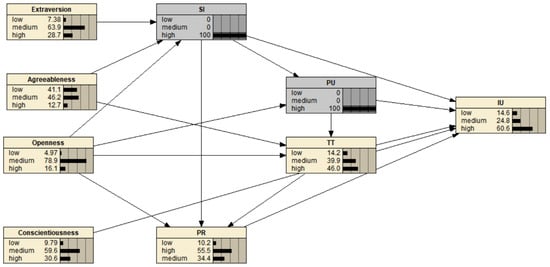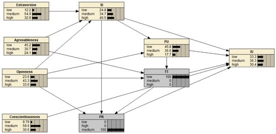 Although SEM is widely used to analyze user psychology, Long et al. [] pointed out that SEM can analyze the intrinsic relationship between variables and confirm whether the effect of the independent variable on the dependent variable is significant, but it is not able to explain the priority of importance of the independent variable and predict the degree of impact of changes in the independent variable on the dependent variable. In contrast, Bayesian networks (BNs) represent the strength of the relationship between variables based on the digitization of probability distributions and can automatically calculate and output the probability of change in the target variable brought about by a change in the independent variable. Therefore, BN is combined with SEM, thus enabling more accurate interpretation and prediction. Delphine et al. [] used a BN to analyze the probabilistic interrelationships between various aspects of AVs and revealed the safety potential of AVs to reduce traffic injuries and fatalities. Đorđe et al. [] investigated the differences in the willingness of people with disabilities to accept AVs and used a Bayesian linear regression model to analyze this, and the model worked well.