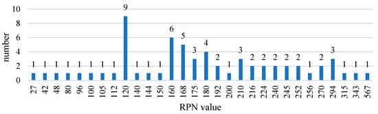 Based on the results of Appendix E, the distribution of both RPN and RPN’ values can be drawn in Figure 1, including the number of repetitiveness. It can be found that various failure modes share the same values in traditional RPN. For example, nine failure modes received 120 (ranked 47), including quality management and improvement C5; financial stability C11; R&D and investment C12; responsiveness C17; management information systems C20; green storage C32; environmentally friendly materials C38; solid waste treatment C42; and culture and religion C53. Six failure modes received 160 (ranked 38). The traditional RPN calculation has obvious disadvantages in terms of the number of repetitions.