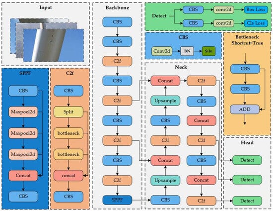 - In the Neck part, based on the feature fusion structure of YOLOv8, a weighted bidirectional pyramid feature fusion strategy is adopted to effectively integrate features of different scales. This significantly improves the model’s performance in detecting small damages without sacrificing computational efficiency, aiming to enhance the model’s accuracy in detecting small target damages on wind turbine blades.