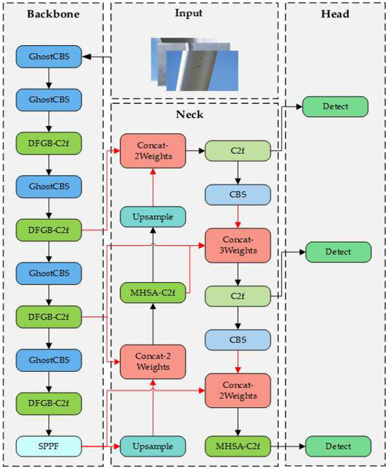 - In the Backbone part, the introduction of Depthwise Factorize Separable Bottleneck (DFSB)-C2f and GhostConv-BatchNorm-SiLU modules (GhostCBS) replaces the original C2f and CBS modules to reduce the model’s parameter count while enhancing its performance in extracting features from raw images.