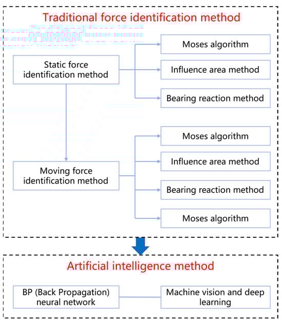 Vehicle force identification is one of the core technical problems to be solved urgently in the management of transportation infrastructure, and it has also been a research hotspot in recent years. To promote the application of vehicle force identification technology on bridges and explore its development direction, the development status of indirect vehicle force identification methods based on bridge response is reviewed during this study. The basic theories of two major methods, including bridge weigh-in-motion (BWIM) and moving force identification (MFI), are described in detail in this study, and then, the key technical principles of bridge force identification are revealed. Secondly, the development status of BWIM in recent years is reviewed from three aspects, including test accuracy, applicability and test efficiency. Combined with a variety of theories, the current status of MFI is analyzed from the establishment of the solution to the equation. Finally, the development direction of an artificial neural network and machine vision technology are prospected in this study. The BP neural network has good self-learning ability and self-adaptive ability, but the algorithm needs to be improved. The identification method based on machine vision represents the current development direction in vehicle force identification, with great potential.