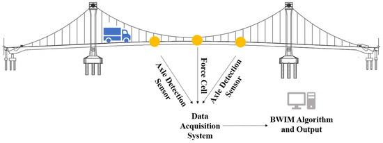 As an important means to obtain vehicle static force, bridge dynamic weighing is widely used in bridge health monitoring, traffic control and other fields. In this method, the bridge is used as a weighing scale to calculate the weight of the vehicle passing on it. The BWIM system flow chart is shown in Figure 2. When the vehicle passes the bridge, the dynamic response of the relevant section of the bridge is measured, the collected data are processed, and the output is calculated to obtain the vehicle’s weight, speed, wheelbase and other parameters. At present, the BWIM system is mostly composed of the following parts: (1) strain sensor, including a weighing sensor and axle detection sensor. The force cell is installed at the bottom of each beam to measure the dynamic response of the bridge. The axle detection sensor, also known as the FAD (Free of Axle Detector) sensor, is installed under the bridge panel to obtain the FAD signal. (2) Data acquisition system; (3) BWIM algorithm and output: the distance between FAD sensors and the time difference of peak response are used to obtain the information of speed and wheelbase; axle information and the BWIM algorithm are used to obtain axle force information.